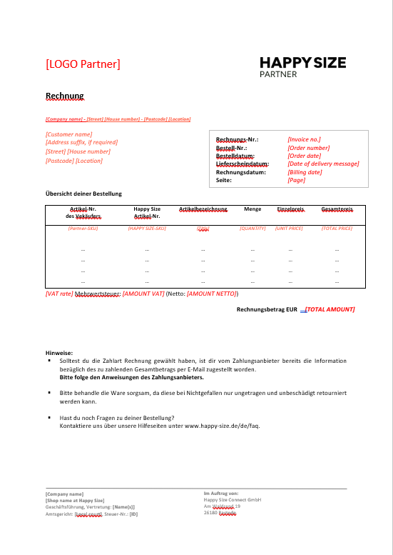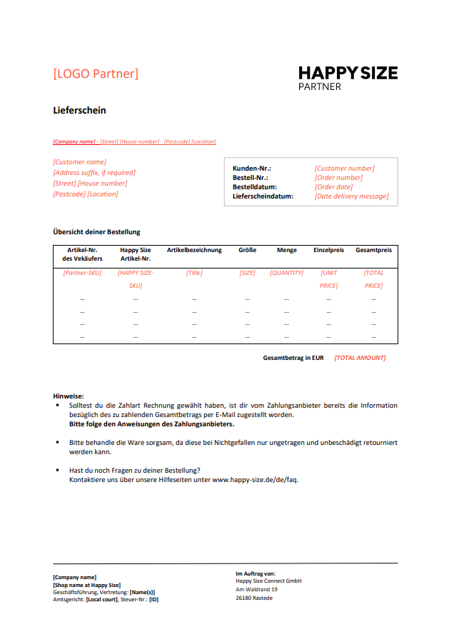 Wir empfehlen dringend, diese Vorlagen zu verwenden, um die vollständige Einhaltung der Happy Size-Anforderungen sicherzustellen und dem Kunden vollständige und korrekte Informationen bereitzustellen. Vor Freischaltung deines Partneraccounts werden deine Lieferdokumente von Happy Size geprüft und freigegeben.