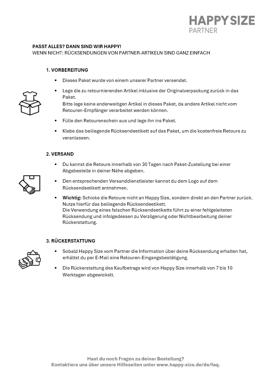 Der Retourenflyer bietet dem Kunden alle relevanten Informationen zum Rückgabe- und Erstattungsprozess. Er muss immer im Paket enthalten sein und sollte möglichst dem Happy Size Vordruck entsprechen.