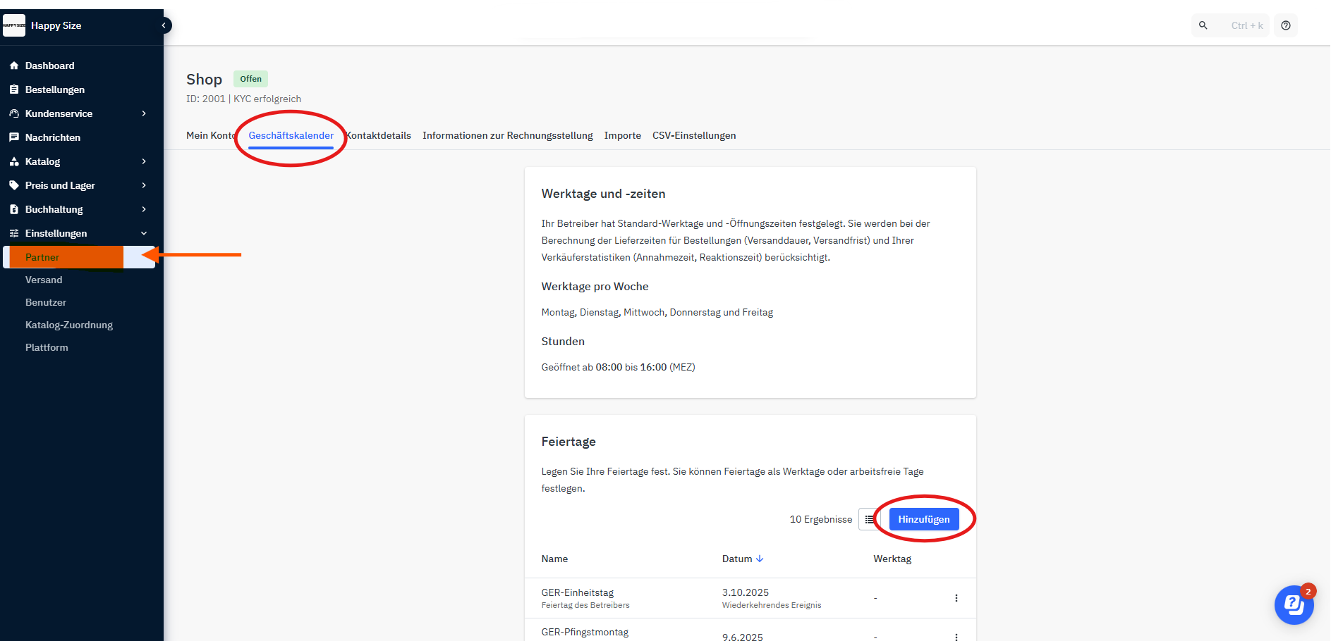 Im "Geschäftskalender" sind alle Werktage- und Zeiten hinterlegt. Unter "Feiertage" kannst du Feiertage, die in deiner Region gelten, hinzufügen.