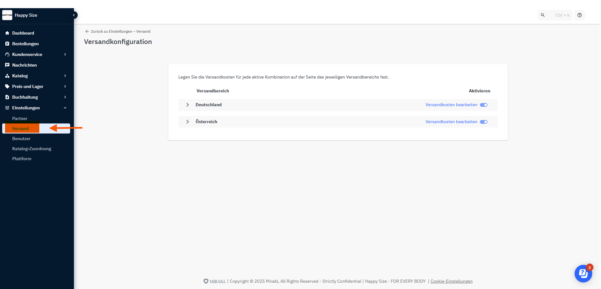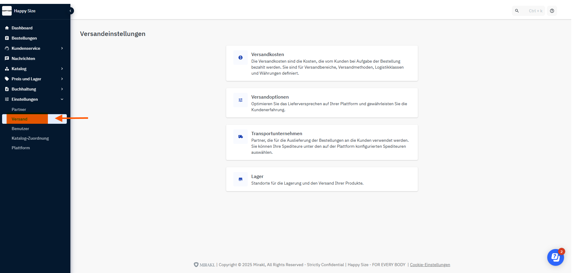 Im Bereich "Versand" kannst du alle Angaben zum Versand hinterlegen und einsehen.