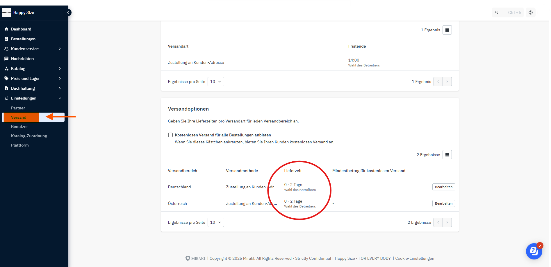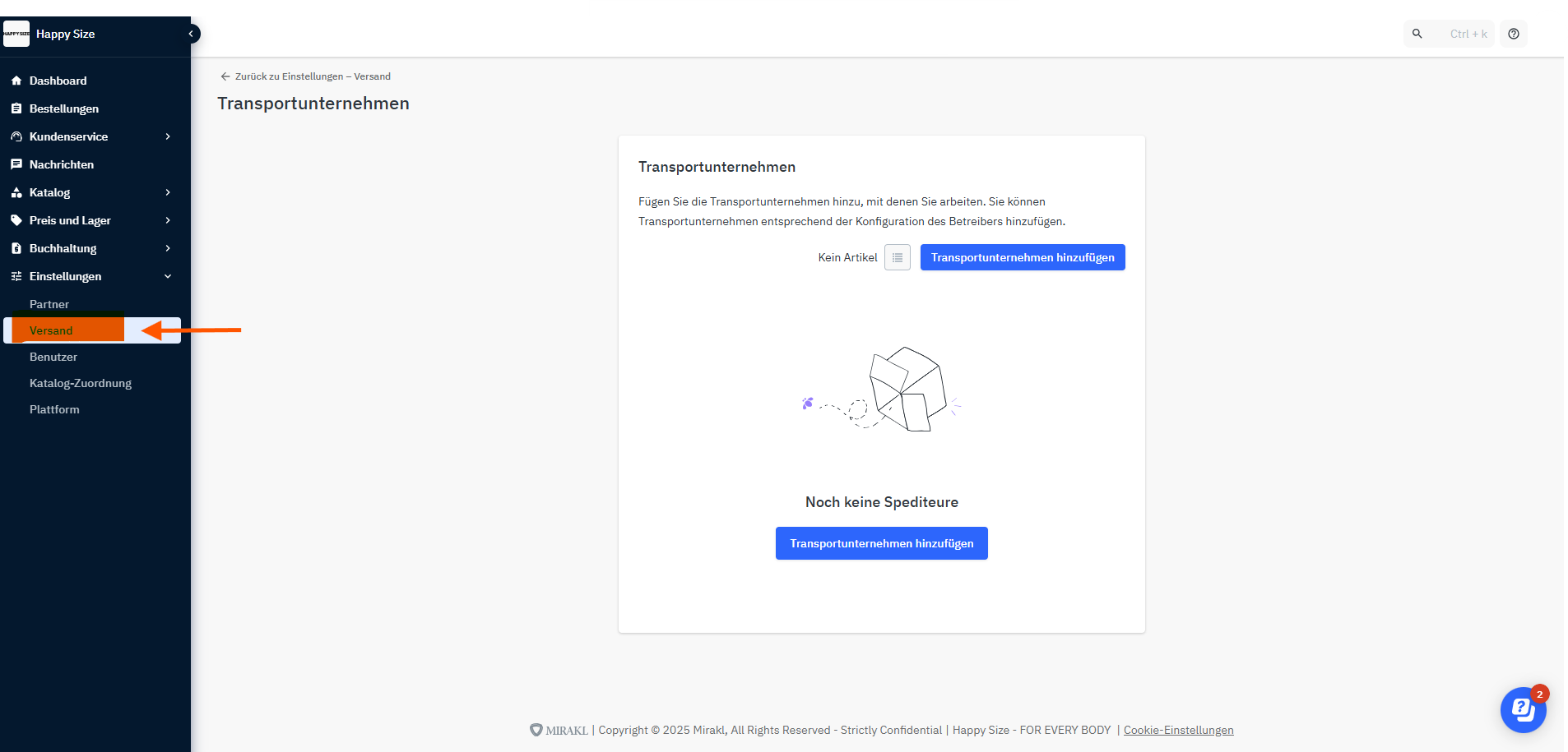 Unter "Transportunternehmen" kannst du Zusteller zwischen einer von Happy Size erstellten Auswahl auswählen.