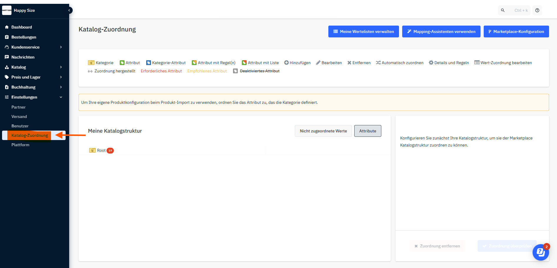 Im Reiter "Katalog-Zuordnung" kannst du dein Produktmapping vornehmen. Wie genau das funktioniert erfährst du im Artikel Mirakl Mapping-Assistent.