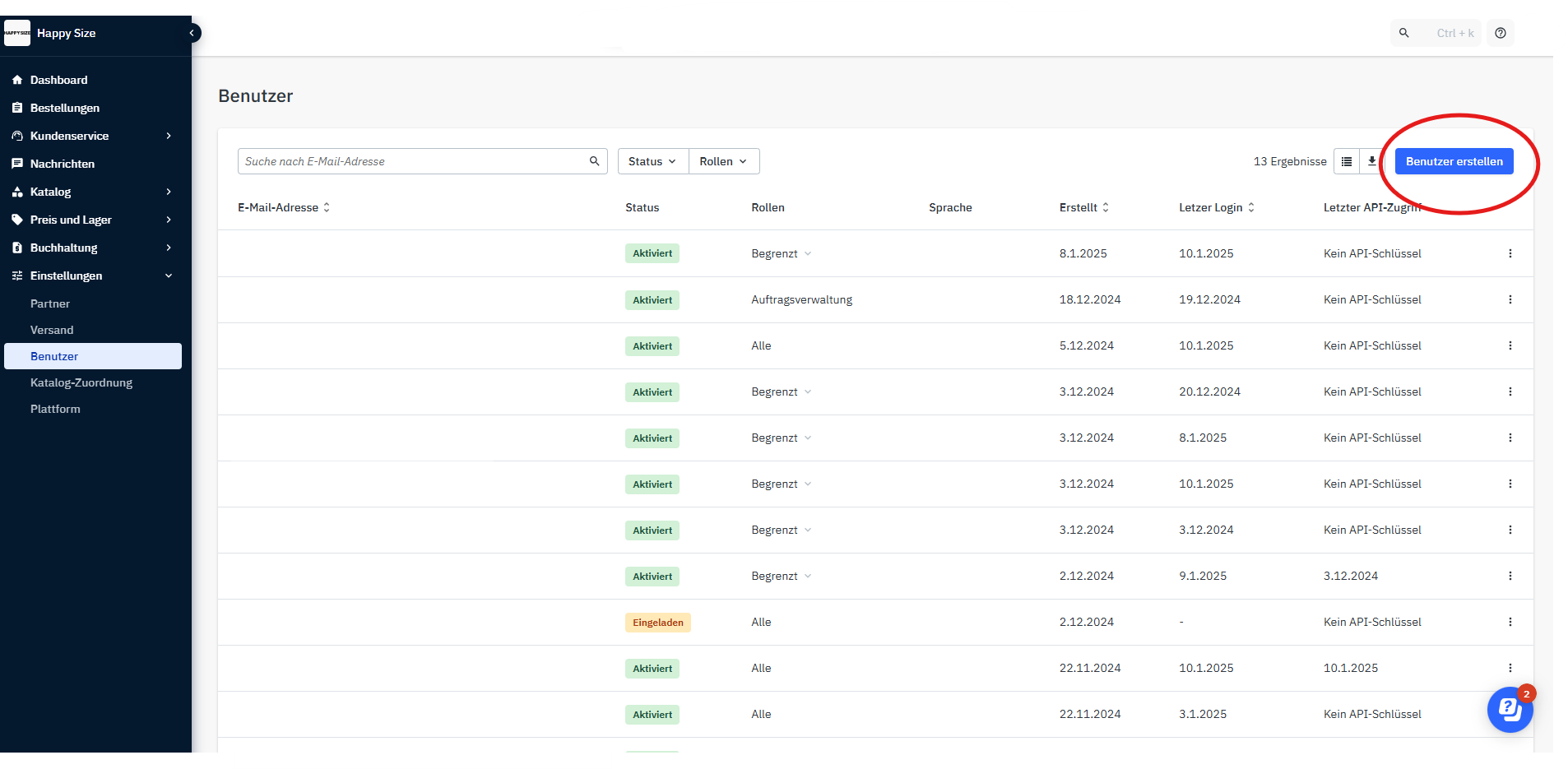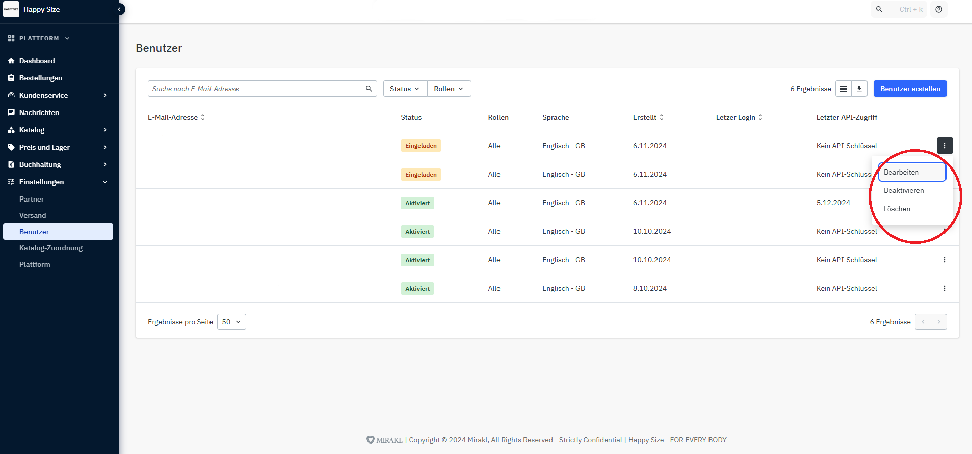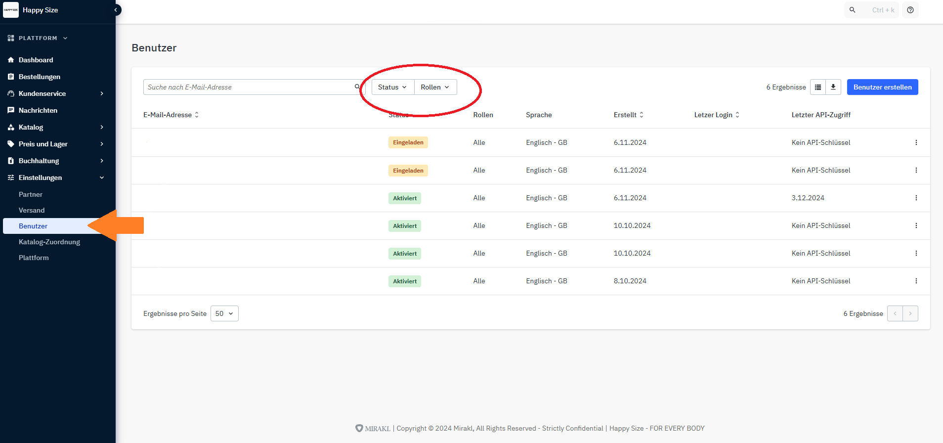 Du kannst in Mirakl die Benutzern unter Einstellungen > Benutzer verwalten.