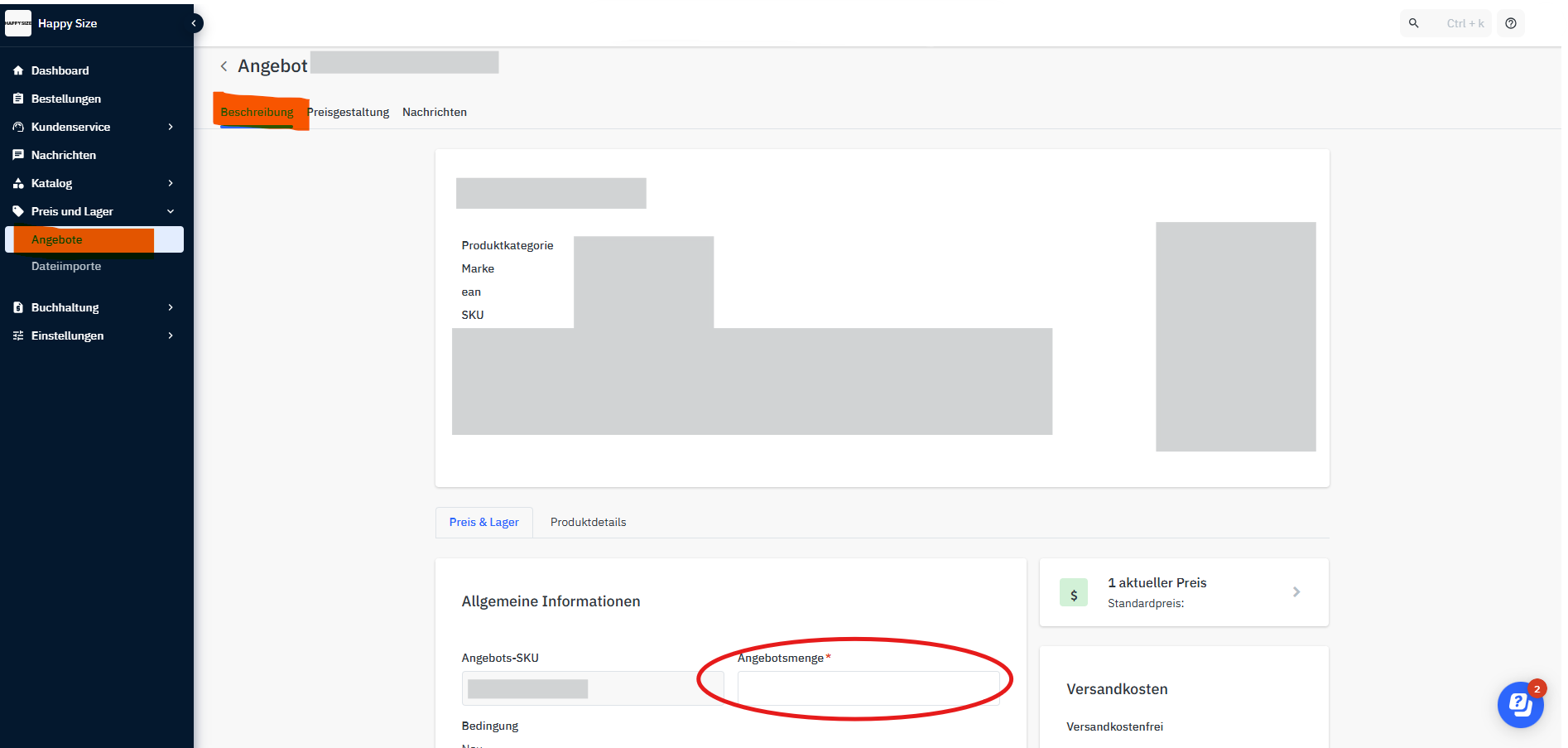 In der Übersicht des ausgewählten Produkts kannst du über Beschreibung den Bestand anpassen.