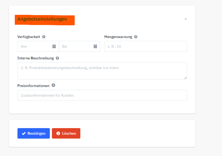 Solltest du in Aktionszeiträumen deine Mengenwarnung anpassen wollen, um früher eine Benachrichtigung bei geringen Beständen zu erhalten, kannst du dies weiter unten unter Angebotseinstellung tun.