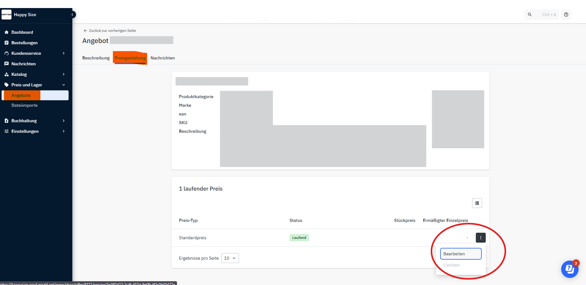 - Klicke auf: Preis und Lager > Angebote > klicke auf das bestehende Produkt ohne Angebot