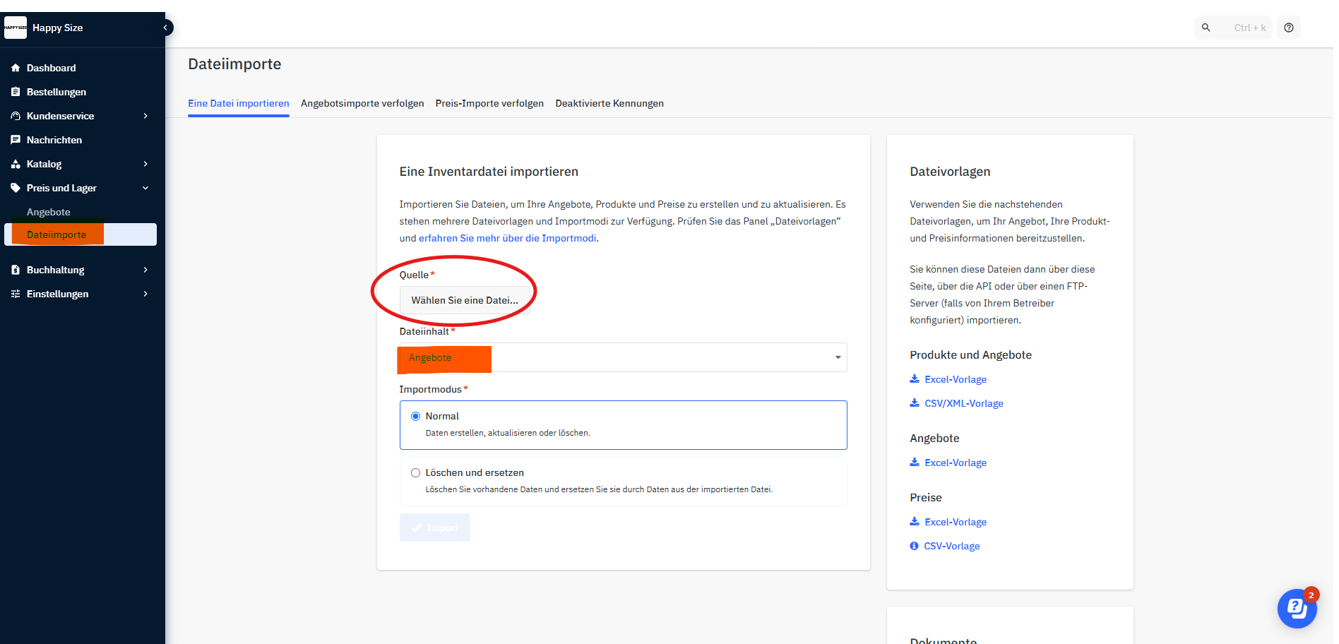 Klicke auf: Preis und Lager > Dateiimporte