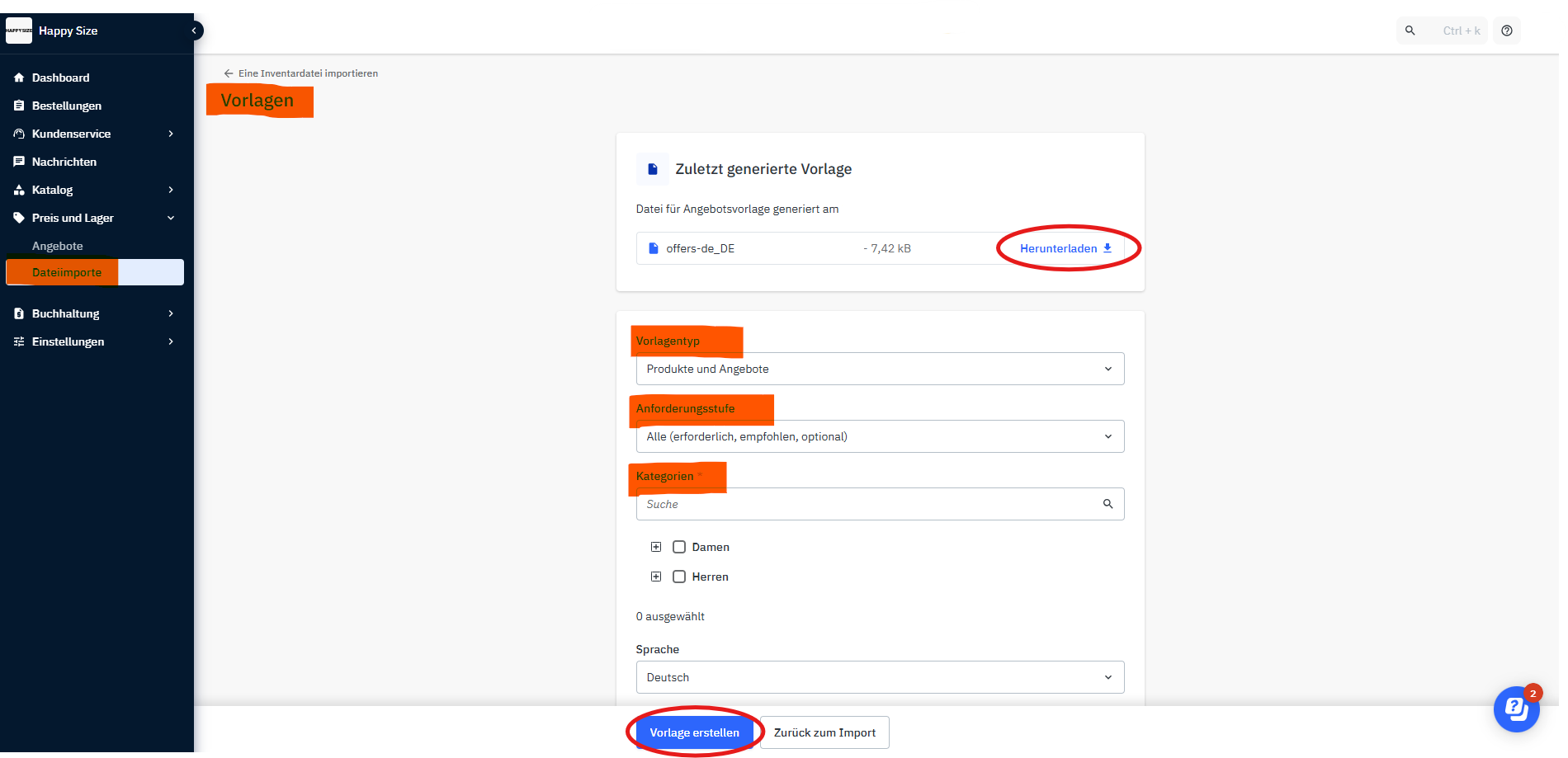 Wenn du eine Angebots- und/oder eine Produkt-Uploadvorlage generieren möchtest, kannst du dir auf der Seite "Vorlage" entweder eine komplett leere Vorlage herunterladen, oder vorher Anforderungsstufe, Kategorien und die Sprache festlegen. Klicke dazu auf "Vorlage erstellen".
