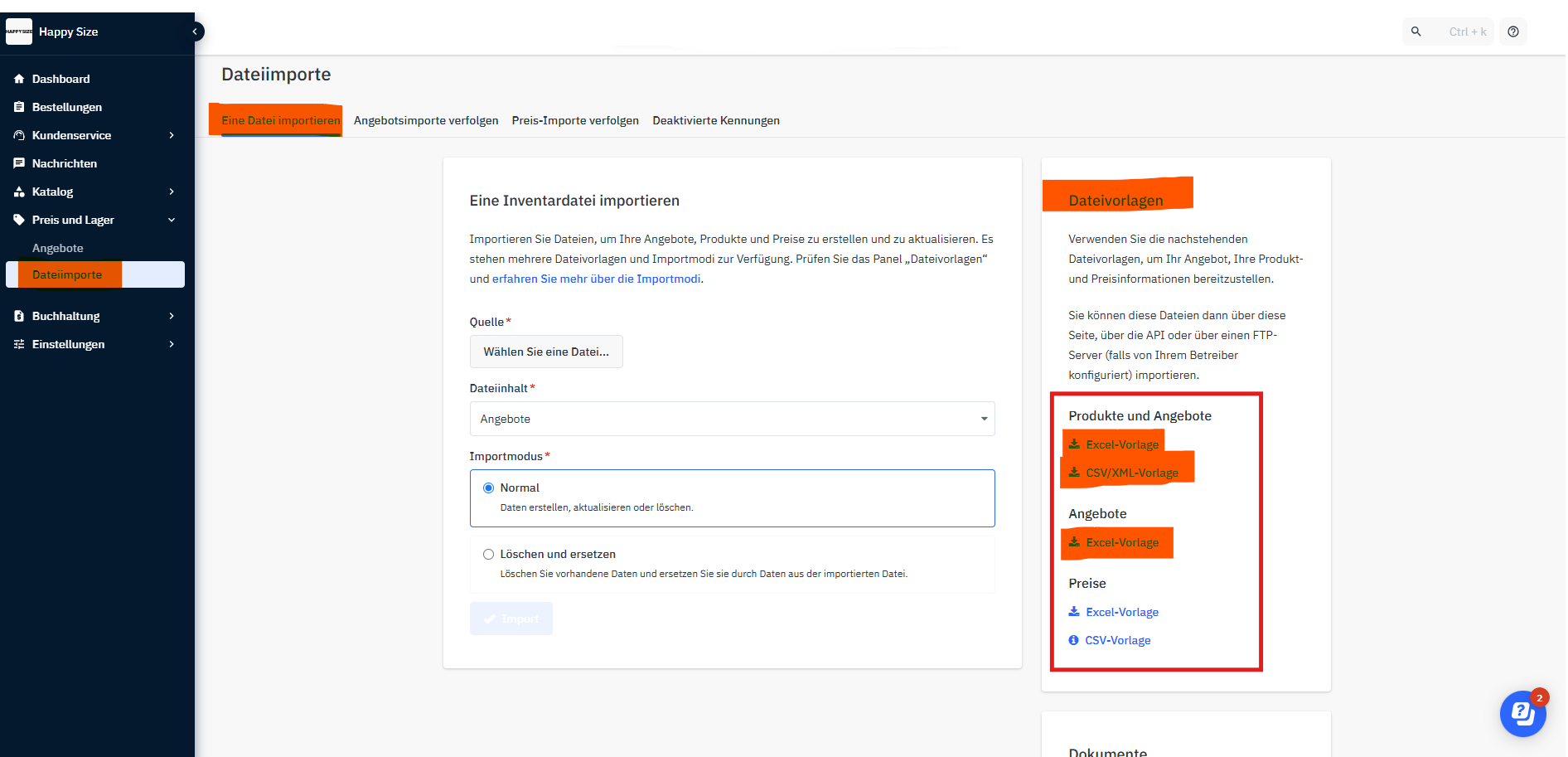 Gehe im Happy Size Backend über Preis und Lager > Dateiimporte.