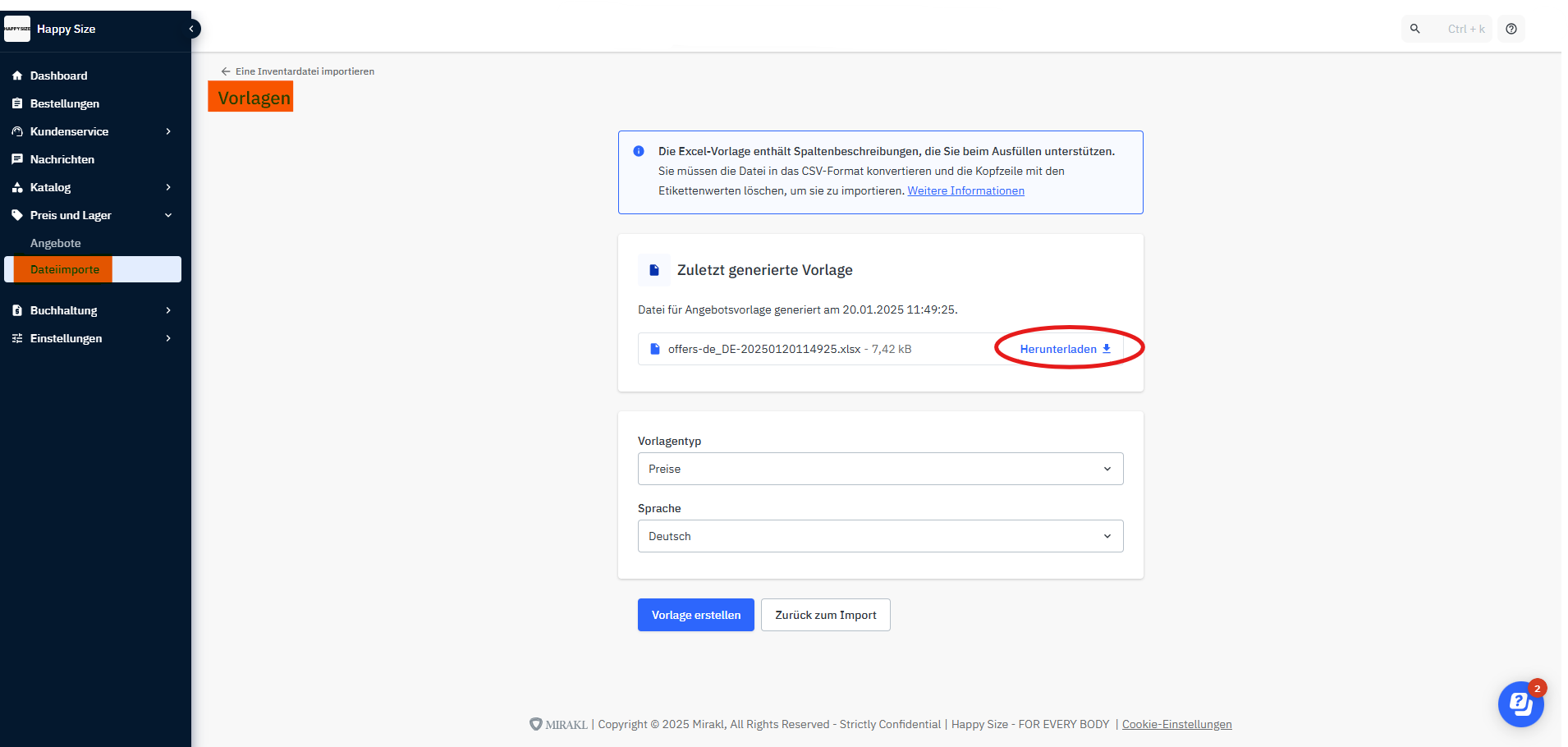 Beachte, dass du für Preise nur eine Excel-Vorlage herunterladen kannst, diese aber für den Upload als CSV-Datei speichern musst.